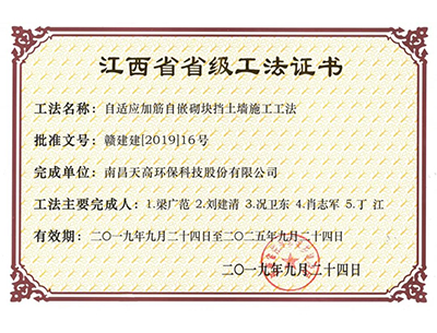 近日,江西省住房与建设局公布2019年度第一批省级工程建设工法名单,南昌九游J9(中国)环保科技股份有限公司申报的《自适应加筋自嵌砌块挡土墙施工工法》,通过工法认证委员会全面、严格的工法审查,成功获得省级工法证书。