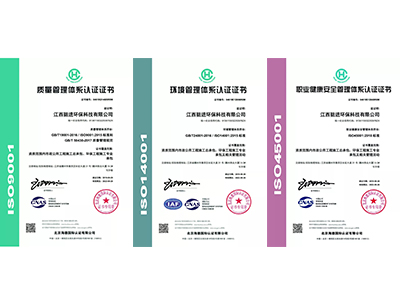 近日,江西挺进环保科技有限公司经过ISO管理体系认证专家的全面、严格、细致的指导和审核,确认挺进环保管理体系符合ISO三大管理体系标准的要求,并于9月29日,获颁发ISO9001质量管理体系认证证书、ISO14001环境管理体系认证证书、ISO45001职业健康安全管理体系认证证书。